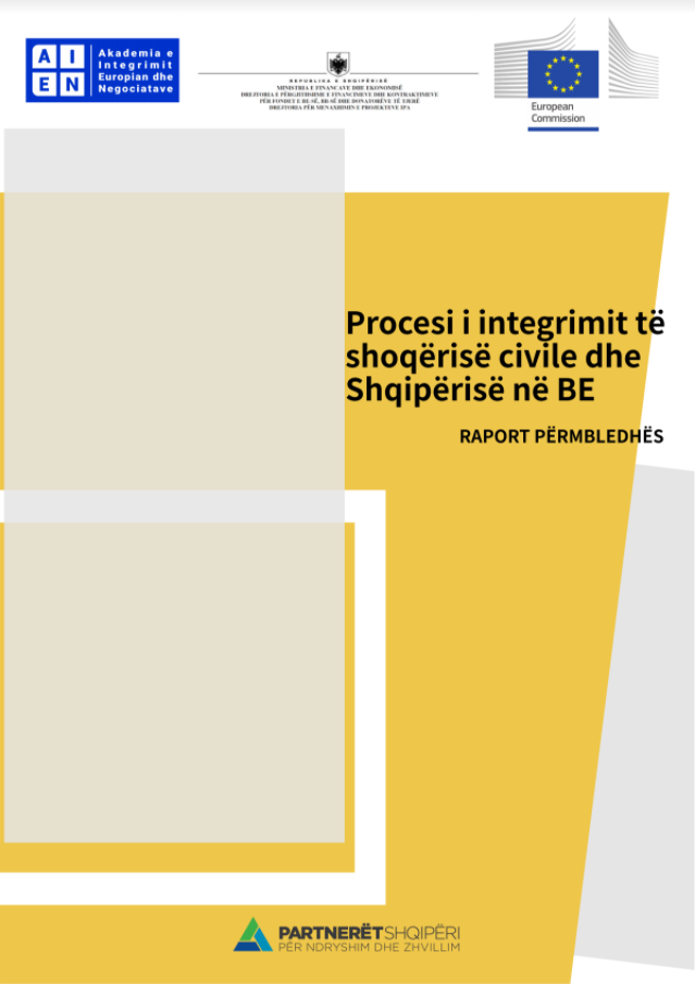 Procesi i Integrimit të Shoqërisë Civile dhe Shqipërisë në BE, është një publikim i përgatitur nga Partnerët Shqipëri për Ndryshim dhe Zhvillim, në bashkëpunim me Akademinë e Integrimit Europian dhe Negociatave, me mbështetjen financiare të Bashkimit Europian, Fondet IPA 2015.